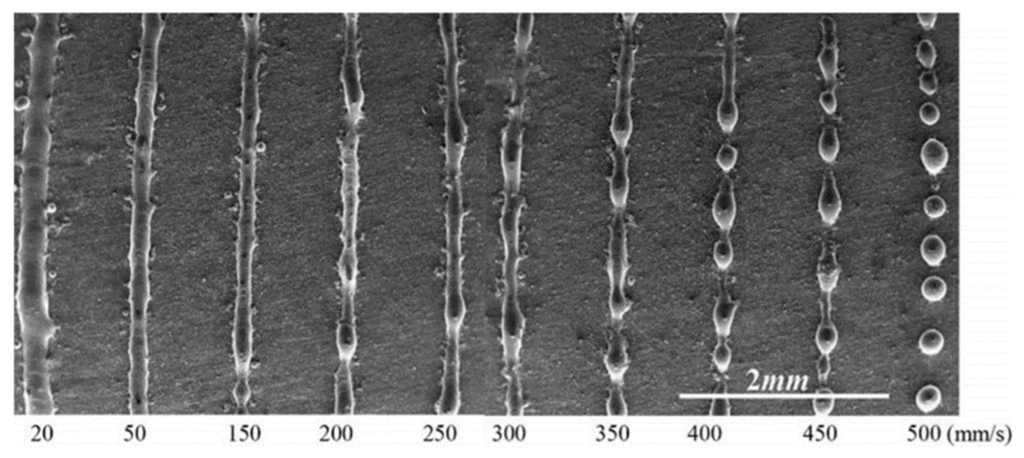 A really cool thing to notice is that when comparing the two images above, we can see that they are quite similar to some results seen in laser powder bed fusion shown below. This makes sense because these processes fundamentally are the same in their binding modality, its just that they differ in the material deposition modality: