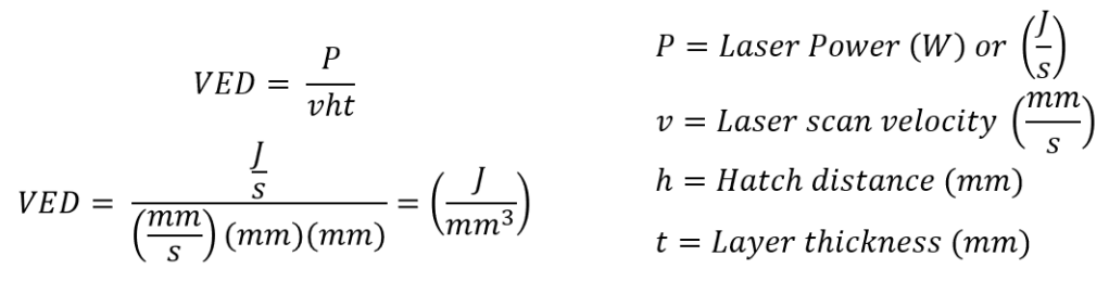 Laser energy density plays a critical role in the process of melting powder to a substrate. It is measured in its volumetric form by the following equation: